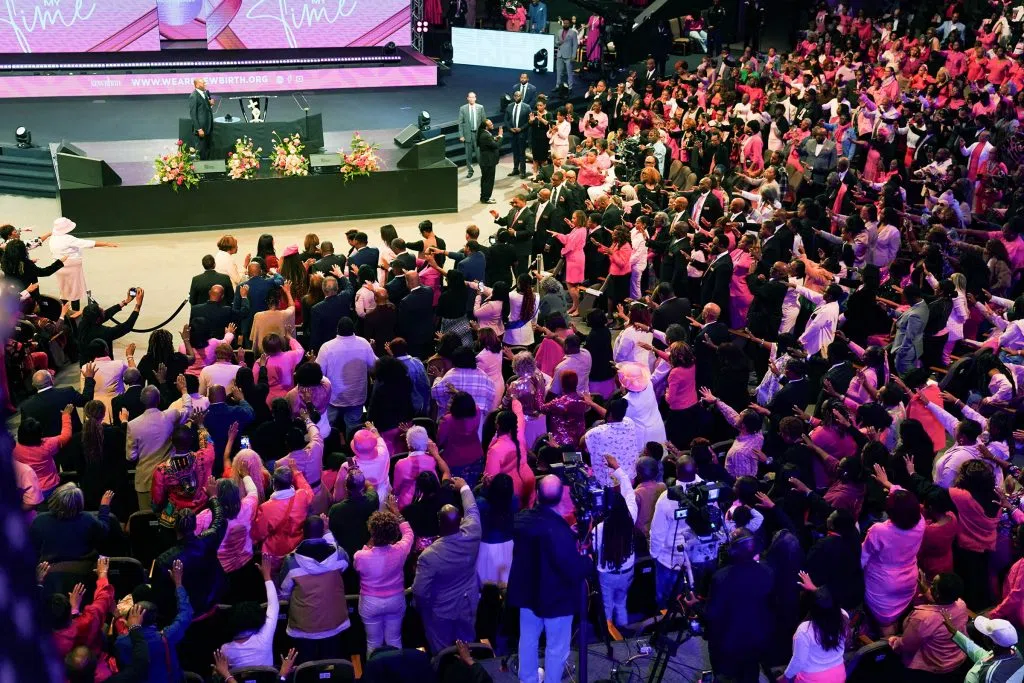 New Birth Pastor Jamal Bryant called the vice president “an American hero, the voice of the future” and “our fearless leader.” He also used his sermon to welcome the idea of America electing its first woman president, saying, “It takes a real man to support a real woman.”