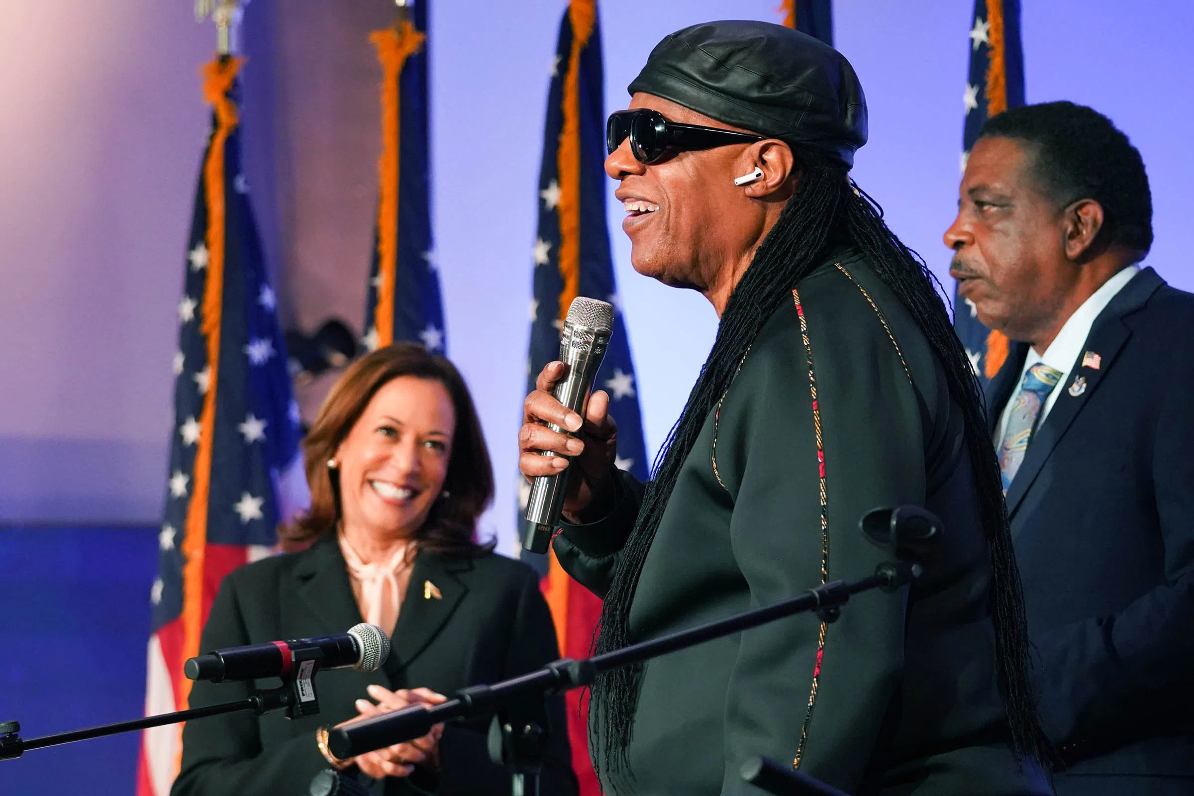 Harris later said that she “had to check off a whole big one” on her bucket list because of Wonder singing her a birthday song, which prompted the singer to spring up and lead the congregation in a quick verse of ”Higher Ground.”