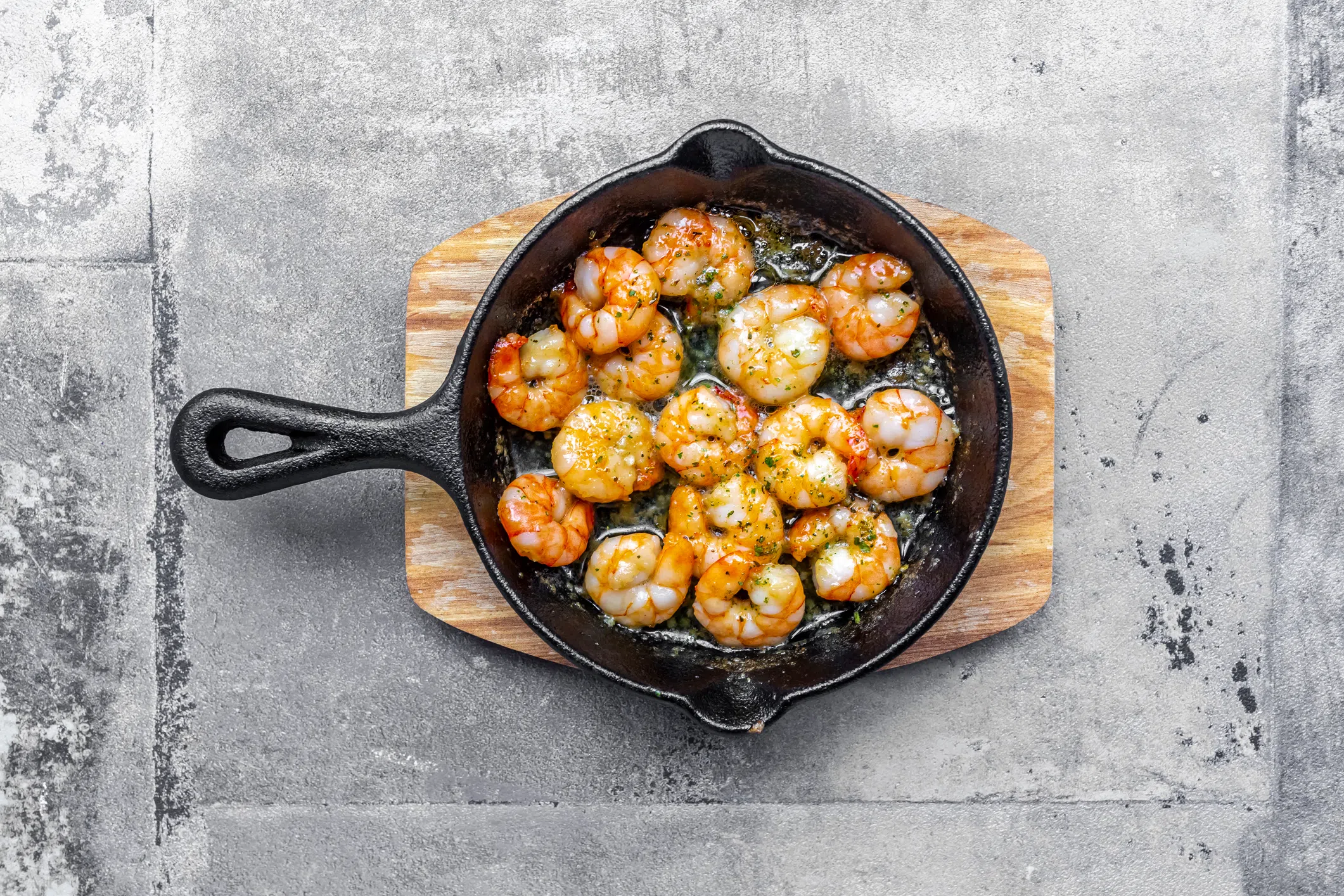 - Heat the remaining 1 tablespoon oil in a large cast-iron skillet over medium-high heat until shimmering. Add the shrimp; cook, undisturbed, until mostly cooked through and golden brown on the bottoms, 2 to 3 minutes. Flip the shrimp; cook, stirring often, until opaque and fully cooked through, 30 seconds to 1 minute.