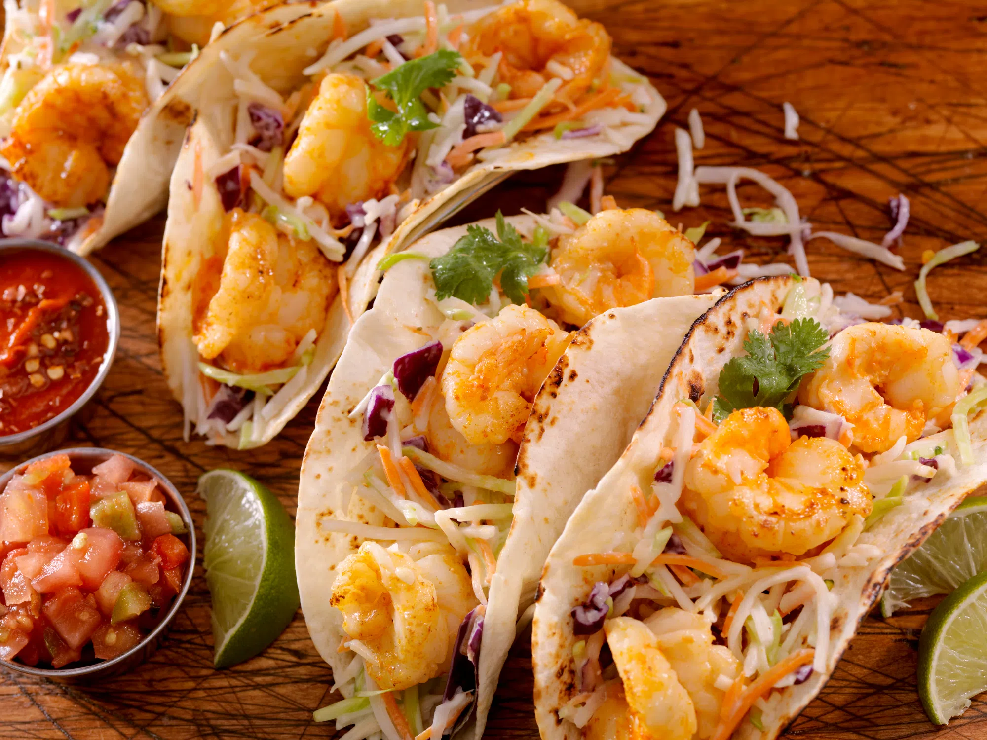 - Divide the shrimp among 8 tortillas; top each with coleslaw mixture. Serve with lime wedges, if desired.