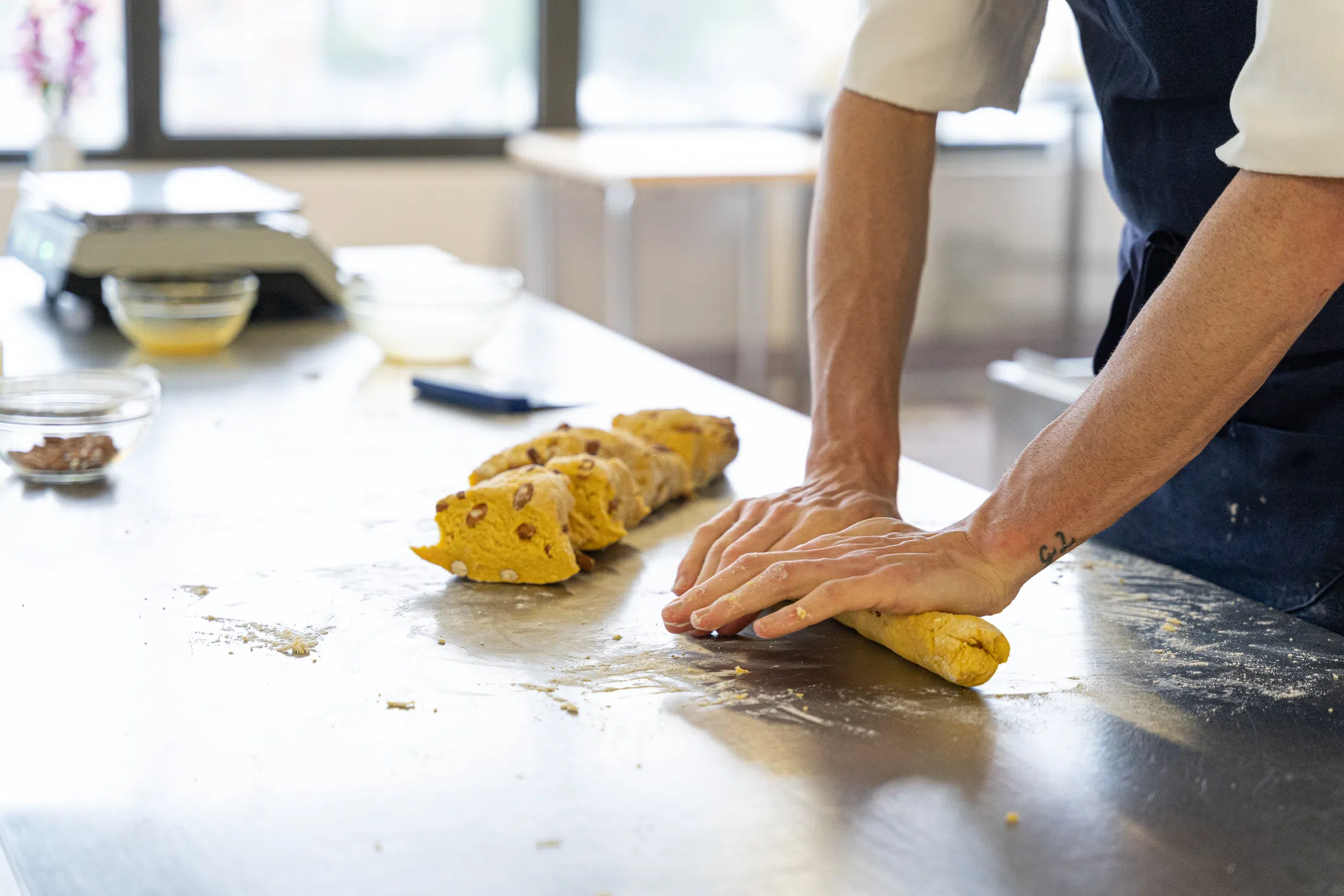 - Put the dough on a lightly floured surface and cut in half. Roll each half into a log, each 12 inches long by 1-inch high. Place the logs on an ungreased cookie sheet and bake for 35 minutes or until the bottoms are lightly brown. Let the logs cool for 5 minutes and then place on a cutting board. Slice each log on a diagonal into 12 1-inch thick pieces. Put the cookies back on the cookie sheet and bake 5 minutes. Turn the cookies over and bake the other side for another 5 minutes. Store cookies in an airtight container.