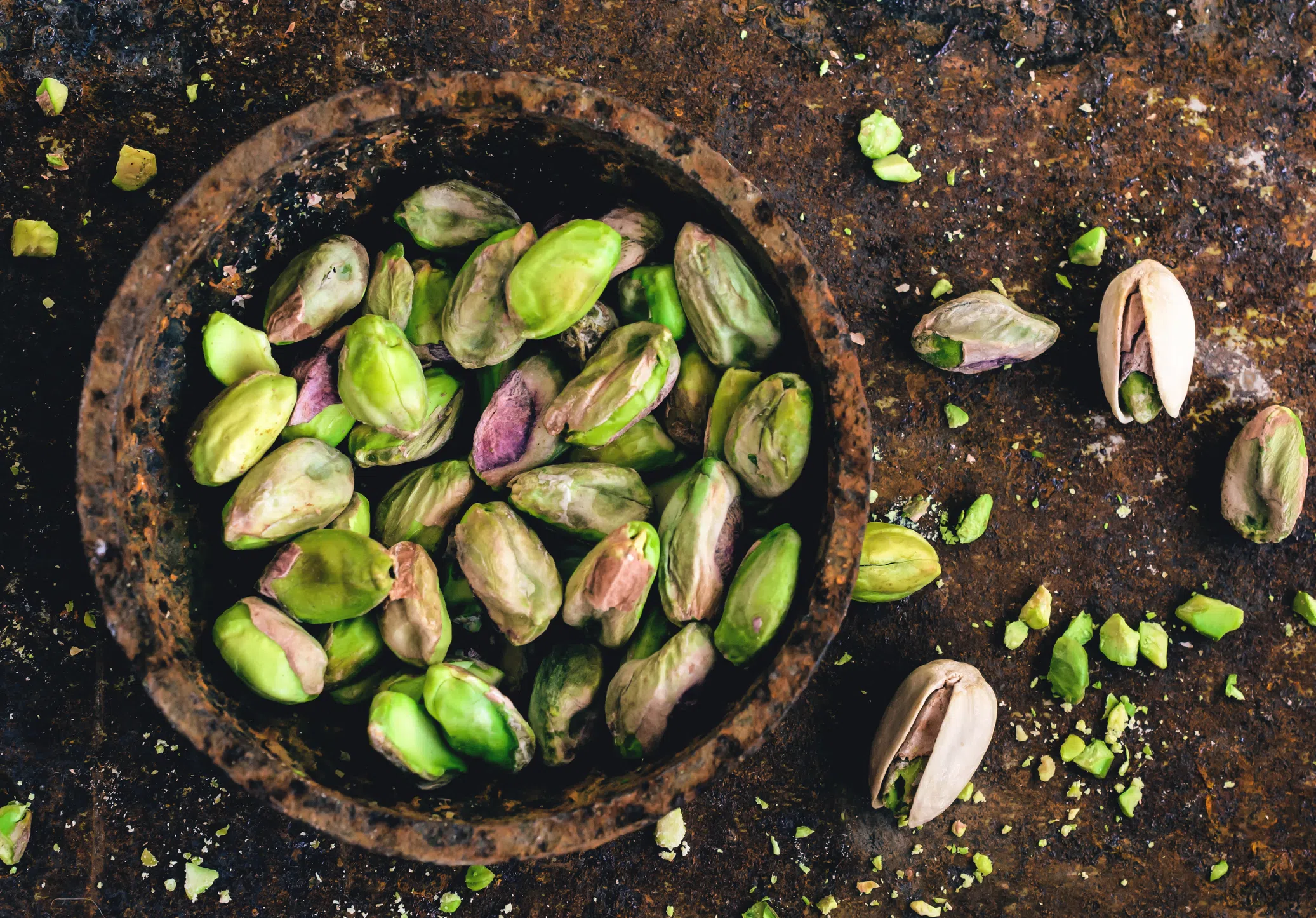 - Lay the pistachios on a cookie sheet in a single layer. Bake for 10 minutes or until the nuts are lightly toasted. Remove from the oven.