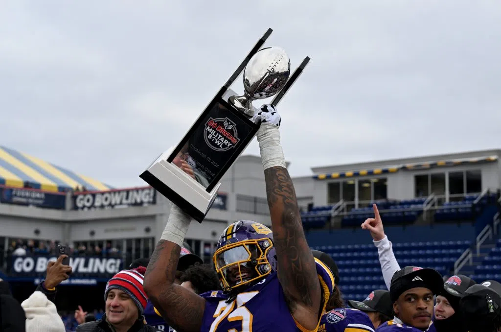 Kyle Long #75 of the East Carolina Pirates celebrates after a 23-17 victory against the Pittsburgh Panthers in the 2025 Go Bowling Military Bowl at Navy-Marine Corps Memorial Stadium on December 27, 2025 in Annapolis, Maryland. (Photo by Greg Fiume/Getty Images)