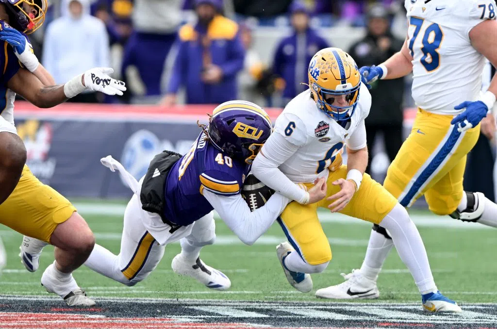 Kendrick Dujour #40 of the East Carolina Pirates sacks and recovers a fumble against Mason Heintschel #6 of the Pittsburgh Panthers in the third quarter of the 2025 Go Bowling Military Bowl at Navy-Marine Corps Memorial Stadium on December 27, 2025 in Annapolis, Maryland. (Photo by Greg Fiume/Getty Images)