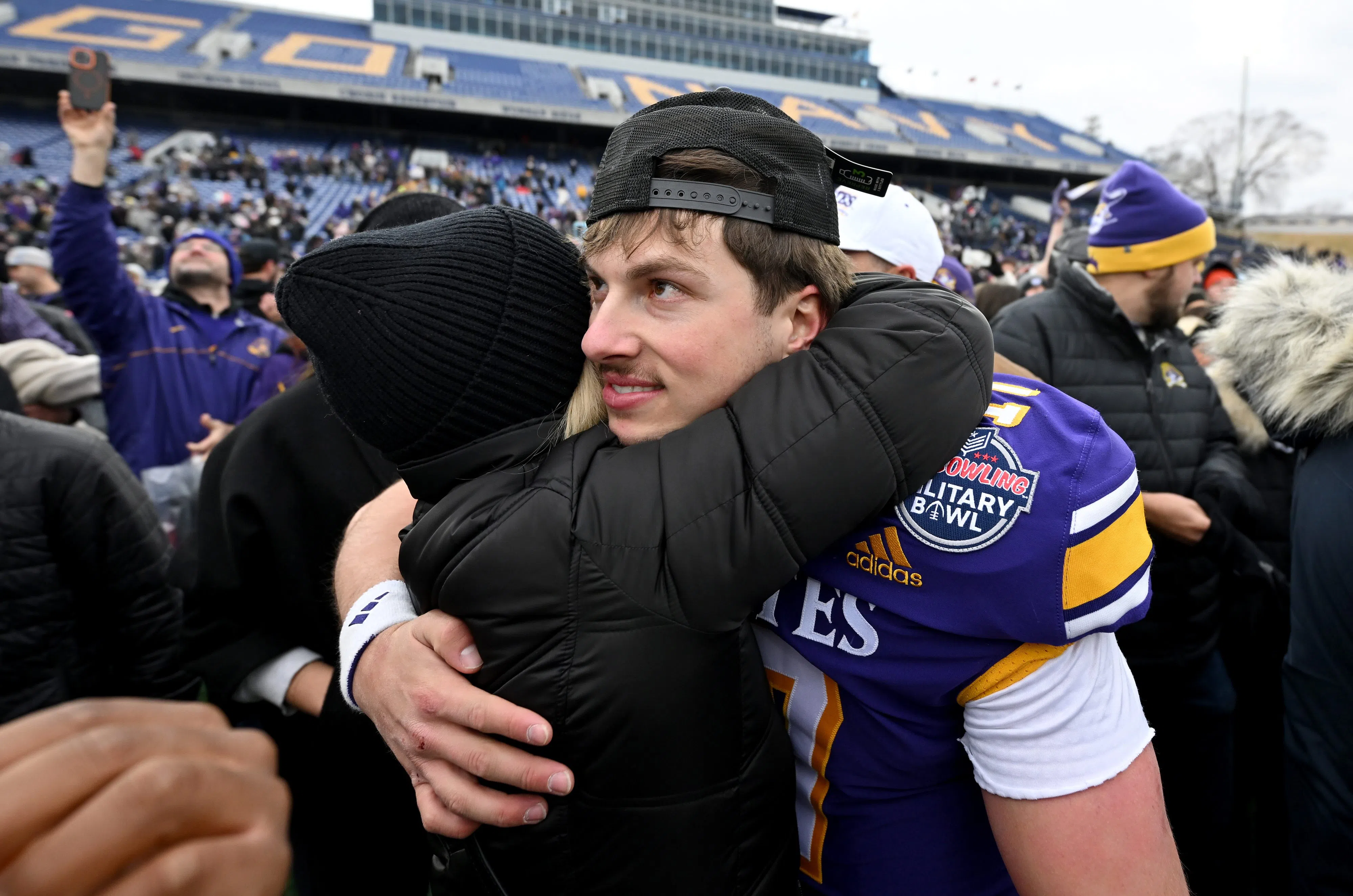 Chaston Ditta #17 of the East Carolina Pirates celebrates with fans after a 23-17 victory against the Pittsburgh Panthers in the 2025 Go Bowling Military Bowl at Navy-Marine Corps Memorial Stadium on December 27, 2025 in Annapolis, Maryland. (Photo by Greg Fiume/Getty Images)