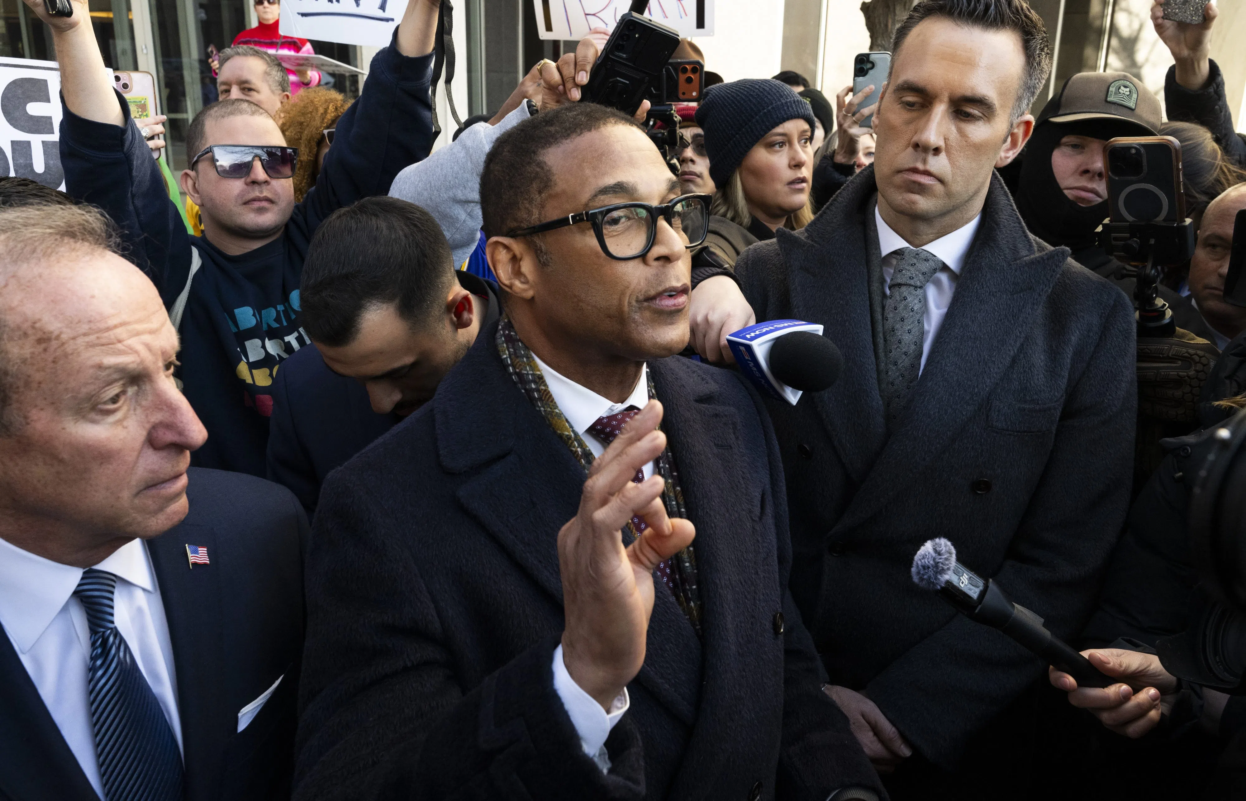 Dozens of supporters gathered outside the courthouse, chanting “Pam Bondi has got to go” and “Protect the press.”