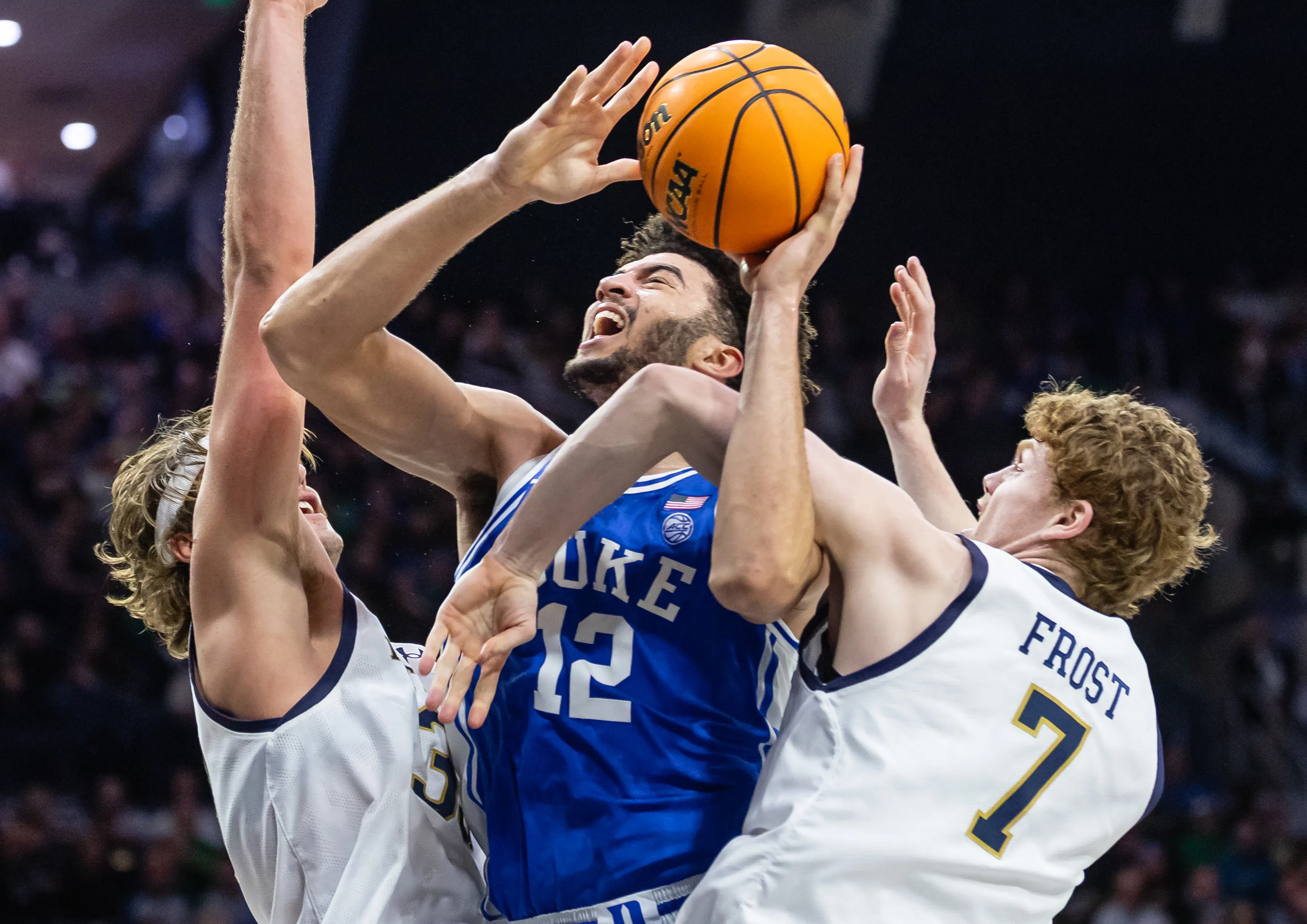 Cameron Boozer #12 of the Duke Blue Devils shoots the ball against Carson Towt #33 and Ryder Frost #7 of the Notre Dame Fighting Irish during the first half at Purcell Pavilion on February 24, 2026 in South Bend, Indiana. (Photo by Michael Hickey/Getty Images)