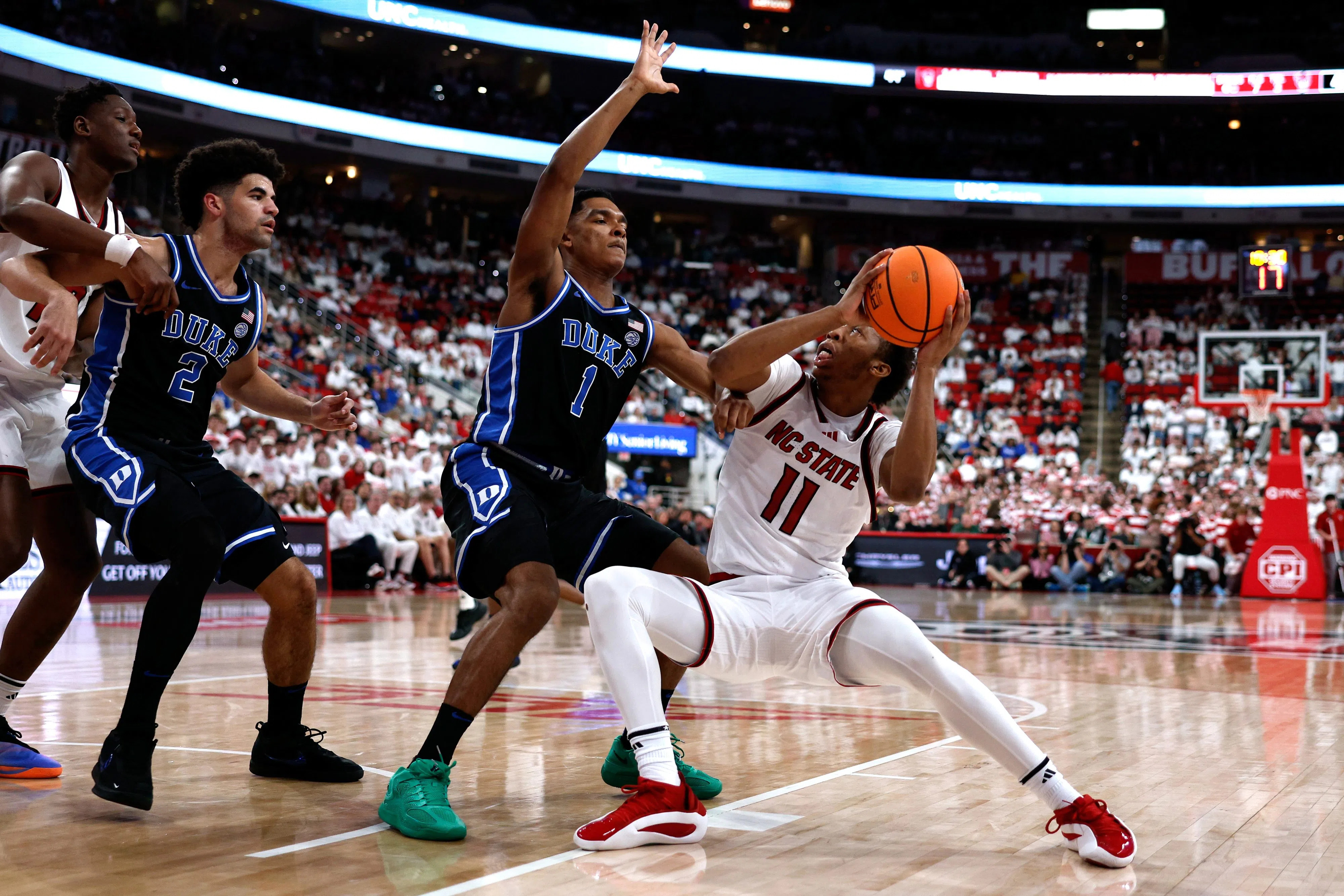 Quadir Copeland #11 of the NC State Wolfpack moves the ball against Caleb Foster #1 of the Duke Blue Devils in the second half at Lenovo Center on March 2, 2026 in Raleigh, North Carolina. (Photo by Lance King/Getty Images)
