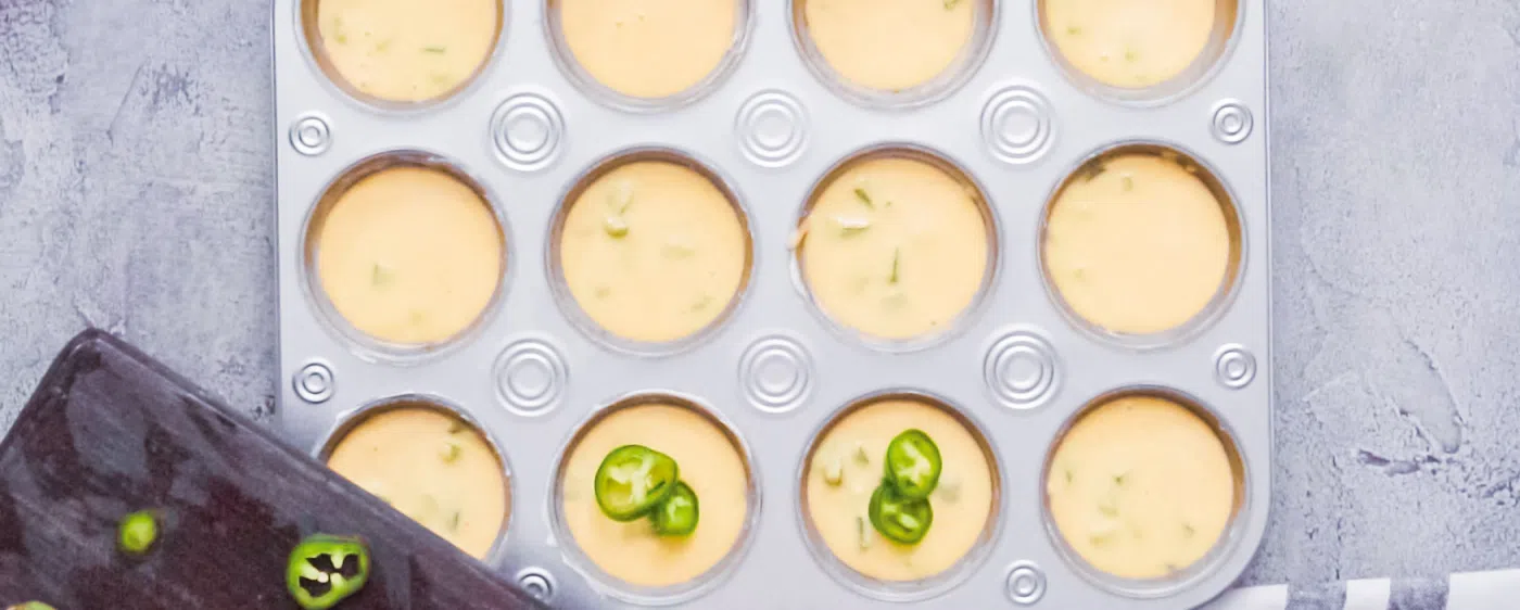 - Garnish each muffin with 1-2 slices of jalapeno on top.