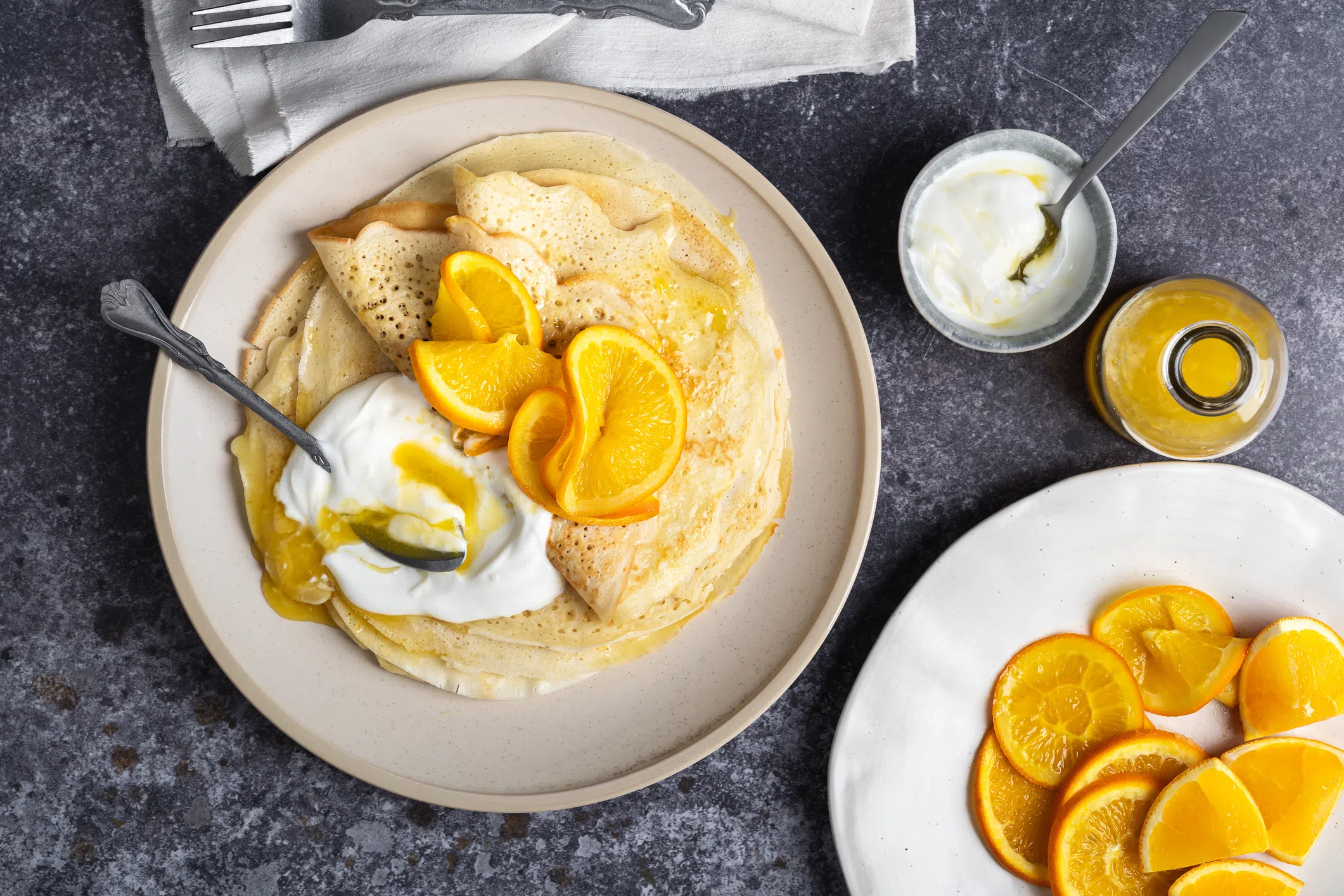 - Increase heat to medium. Add Grand Marnier and cognac; carefully ignite sauce using a long-handled lighter. Carefully spoon flaming sauce over crêpes using a long-handled, heatproof spoon until flames subside, about 30 seconds. Transfer crêpes to a platter; spoon any extra sauce over top. Serve immediately.