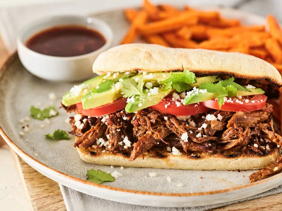 - Brush olive oil on both sides of bread. Place on grid over medium, ash-covered coals or over medium heat on preheated gas grill and grill for 1 to 2 minutes on each side. Remove toasted bread and place bottom pieces on a sheet pan setting aside the tops. Top bottoms of bread evenly with shredded Birria and cotija cheese. Bake in a preheated 375°F oven 8 to 10 minutes or until cheese is slightly melted. Remove from oven and top sandwiches with tomatoes, avocado and cilantro.