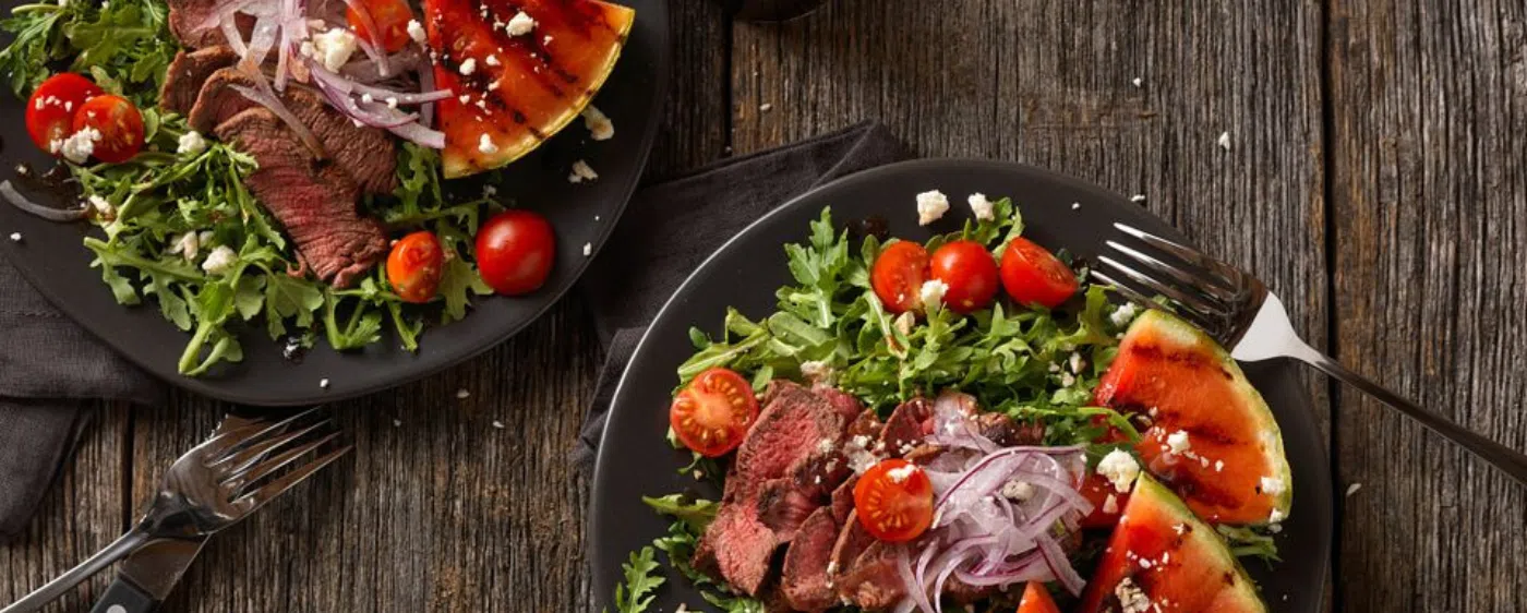 Grilled Steak and Watermelon Salad Photo Courtesy of BeefItsWhatsForDinner.com Grilled Steak and Watermelon Salad Recipe from Beef It's What's For Dinner Prep time: 5 minutes Cooking time: 14-16 minut...