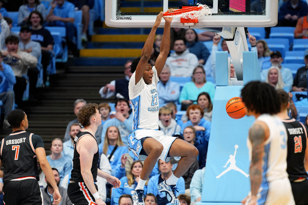 Jalen Washington #13 of the North Carolina Tar Heels dunks against the Campbell Fighting Camels during the first half of the game at the Dean E. Smith Center on December 29, 2024 in Chapel Hill, North Carolina. (Photo by Grant Halverson/Getty Images)