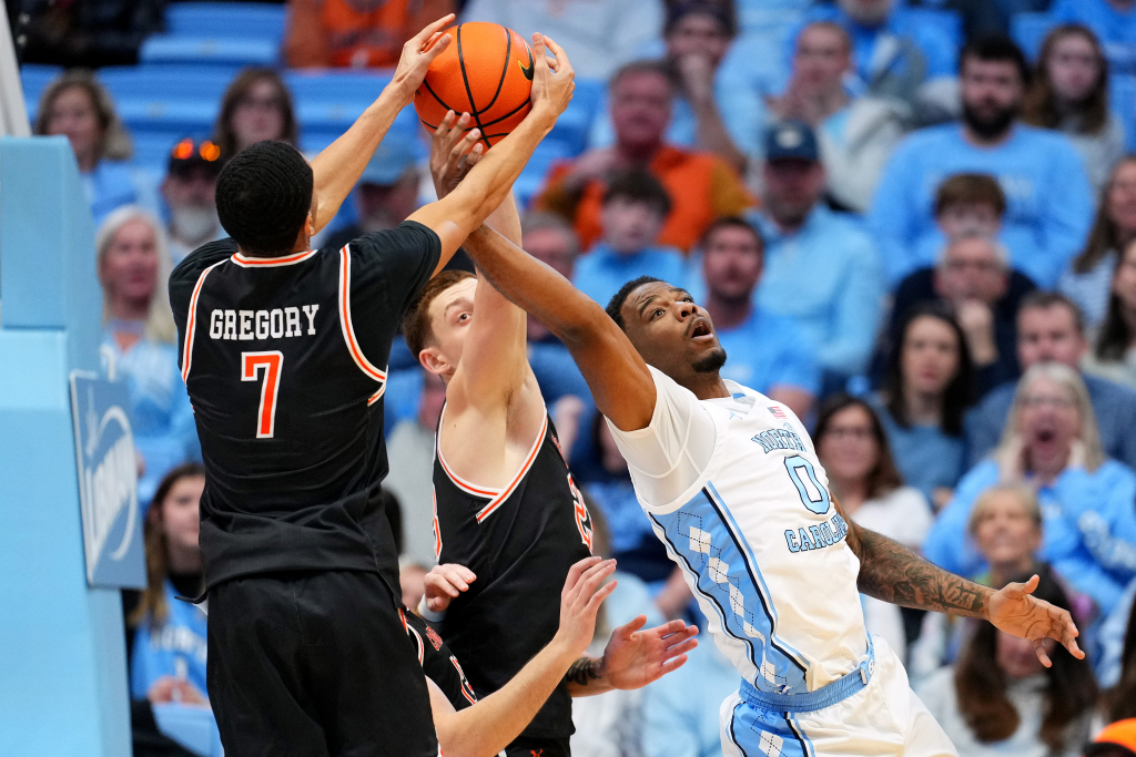 Ty Claude #0 of the North Carolina Tar Heels defends a shot by Nolan Dorsey #21 of the Campbell Fighting Camels during the second half of the game at the Dean E. Smith Center on December 29, 2024 in Greensboro, North Carolina. (Photo by Grant Halverson/Getty Images)