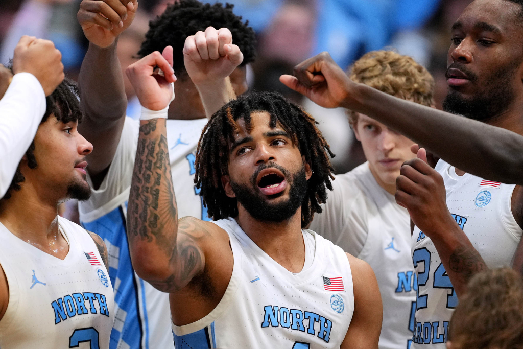 RJ Davis #4 of the North Carolina Tar Heels, center, huddles with teammates during the second half of the game against the Campbell Fighting Camels at the Dean E. Smith Center on December 29, 2024 in Greensboro, North Carolina. (Photo by Grant Halverson/Getty Images)