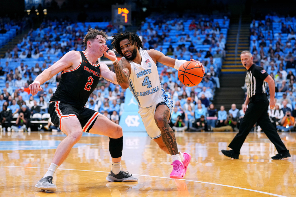 RJ Davis #4 of the North Carolina Tar Heels drives to the basket against Colby Duggan #2 of the Campbell Fighting Camelsduring the second half of the game at the Dean E. Smith Center on December 29, 2024 in Greensboro, North Carolina. (Photo by Grant Halverson/Getty Images)