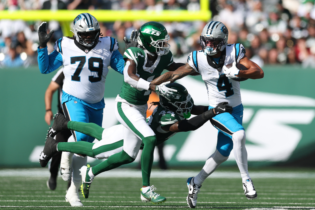 Tetairoa McMillan #4 of the Carolina Panthers is tackled by Sauce Gardner #1 and Jamien Sherwood #44 of the New York Jets during the second quarter in the game at MetLife Stadium on October 19, 2025 in East Rutherford, New Jersey. (Photo by Ishika Samant/Getty Images)