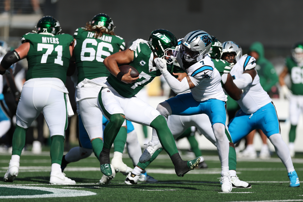 Justin Fields #7 of the New York Jets is sacked by Tre’Von Moehrig #7 of the Carolina Panthers during the second quarter in the game at MetLife Stadium on October 19, 2025 in East Rutherford, New Jersey. (Photo by Al Bello/Getty Images)