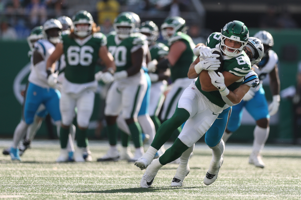 Mason Taylor #85 of the New York Jets is tackled by Jimmy Horn Jr. #15 of the Carolina Panthers during the second quarter in the game at MetLife Stadium on October 19, 2025 in East Rutherford, New Jersey. (Photo by Ishika Samant/Getty Images)